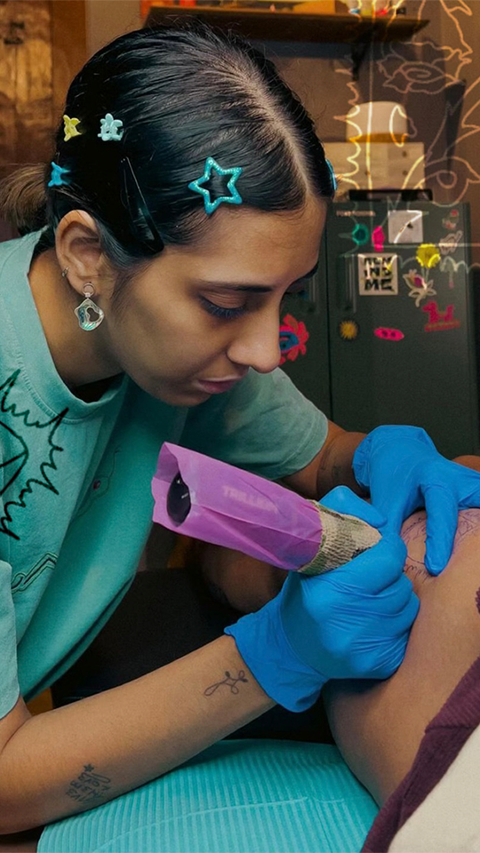 While studying in Chicago, she discovered stick and poke tattoos, focusing on personal connections and community. In 2017, Shreya started “Tender Pokes” in India to promote handpoke tattoos and help others feel empowered about their bodies.